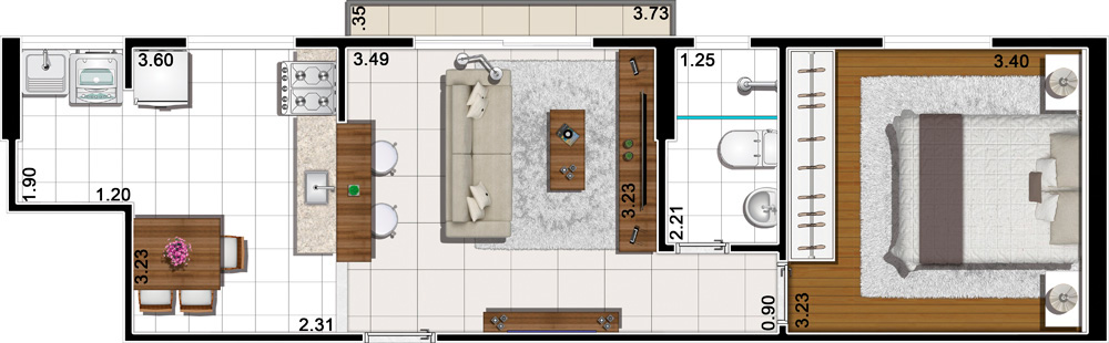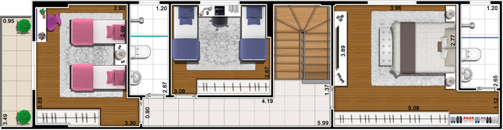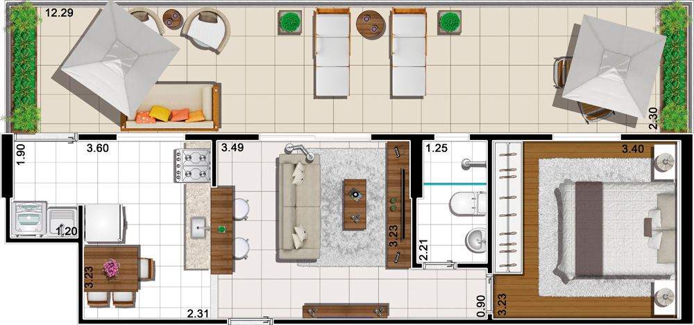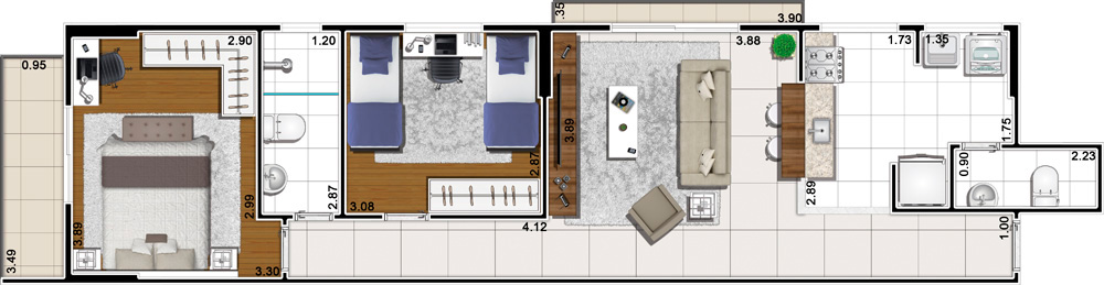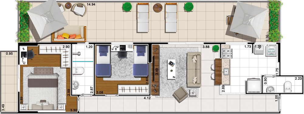 “Ilustrações artísticas das plantas. Móveis com dimensões comerciais, não fazendo parte do contrato, medidas internas face a face”